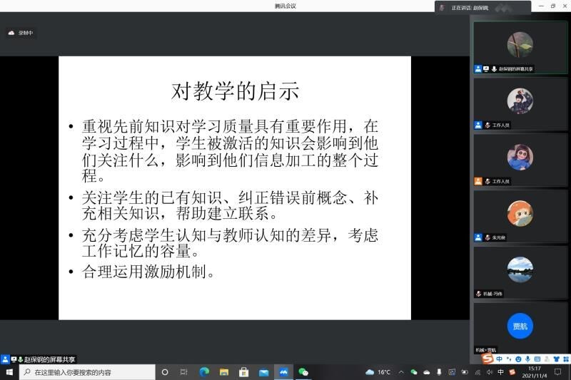 赵保钢对经典的赫尔巴特五段课堂教学、凯洛夫六环节课堂教学、加涅九段教学事件等课堂教学常用设计模式做了深入剖析,并通过具体的课堂教学案例对教学设计的文本结构进行了详细分析,他认为教师教学要跳出教材与大纲,站在更高的角度看待教学目标,对长远目标有更明确的认识,还建议新教师参考教学比赛选题的“五个原则”和希尔伯特的优质课堂教学“十项特征”,为参训教师优化课堂教学设计提供了丰富的实战经验。最后,赵保钢强调大学是培养各行各业人才的重要阵地,教师应始终坚持教学研究,促进教学发展,以学生为中心,引导学生全面发展。