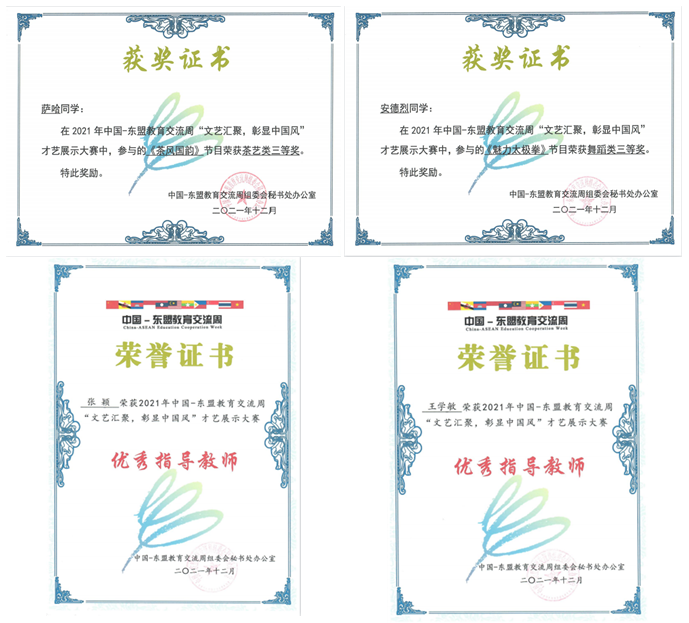 近日,米兰国际学生萨哈、安德烈同学在中国-东盟教育交流周之“文艺汇聚彰显中国风”才艺展示大赛中分别荣获“三等奖”,张颖、王学敏老师分别荣获“优秀指导教师”荣誉称号。