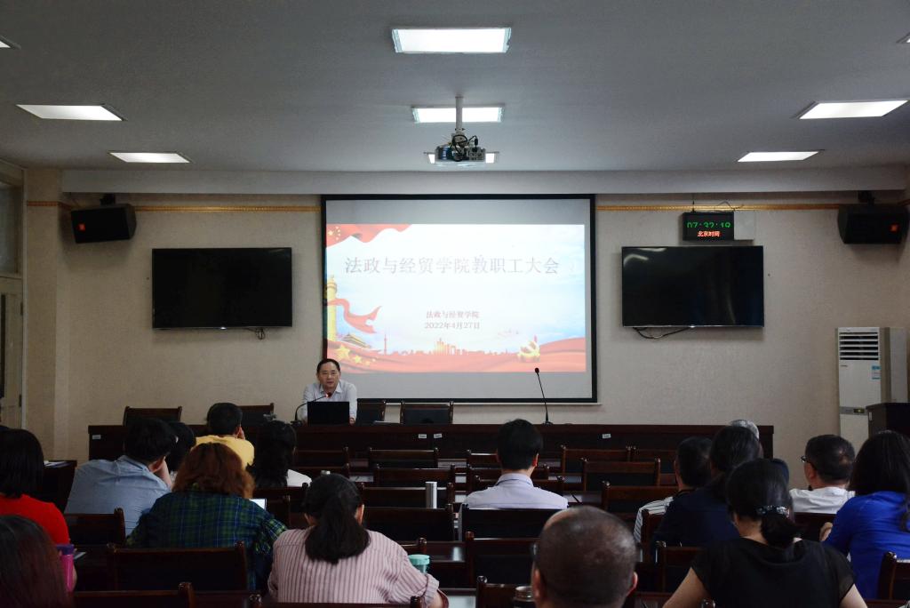 4月28日下午,法政与经贸学院在厚德楼H312会议室召开全院教职工大会。学校党委副书记干勤参加了会议。会议由学院党总支书记田懿主持。