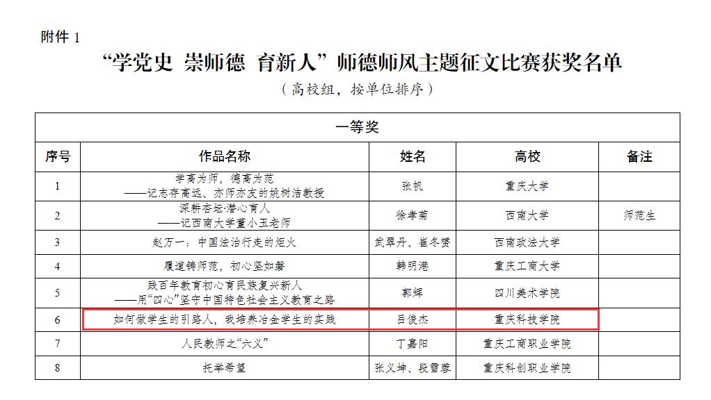 近日,重庆市教育委员会公布《关于“学党史崇师德育新人”师德师风主题征文比赛和优秀案例获奖作品的通报》,米兰教师吕俊杰的作品《如何做学生的引路人,我培养冶金学生的实践》获得“学党史崇师德育新人”师德师风主题征文比赛高校组一等奖。