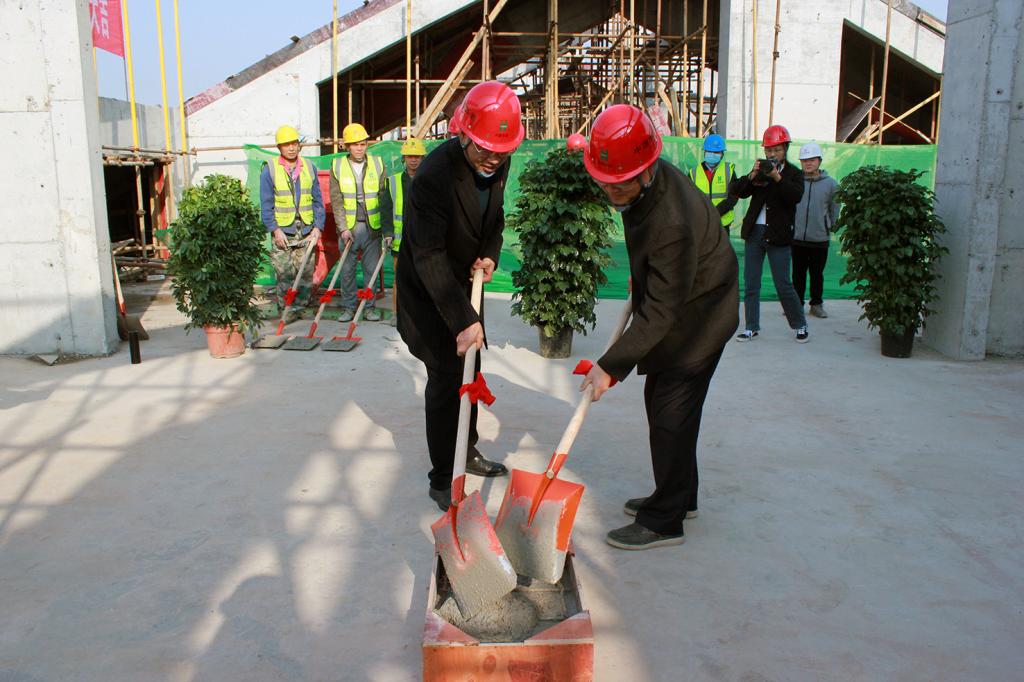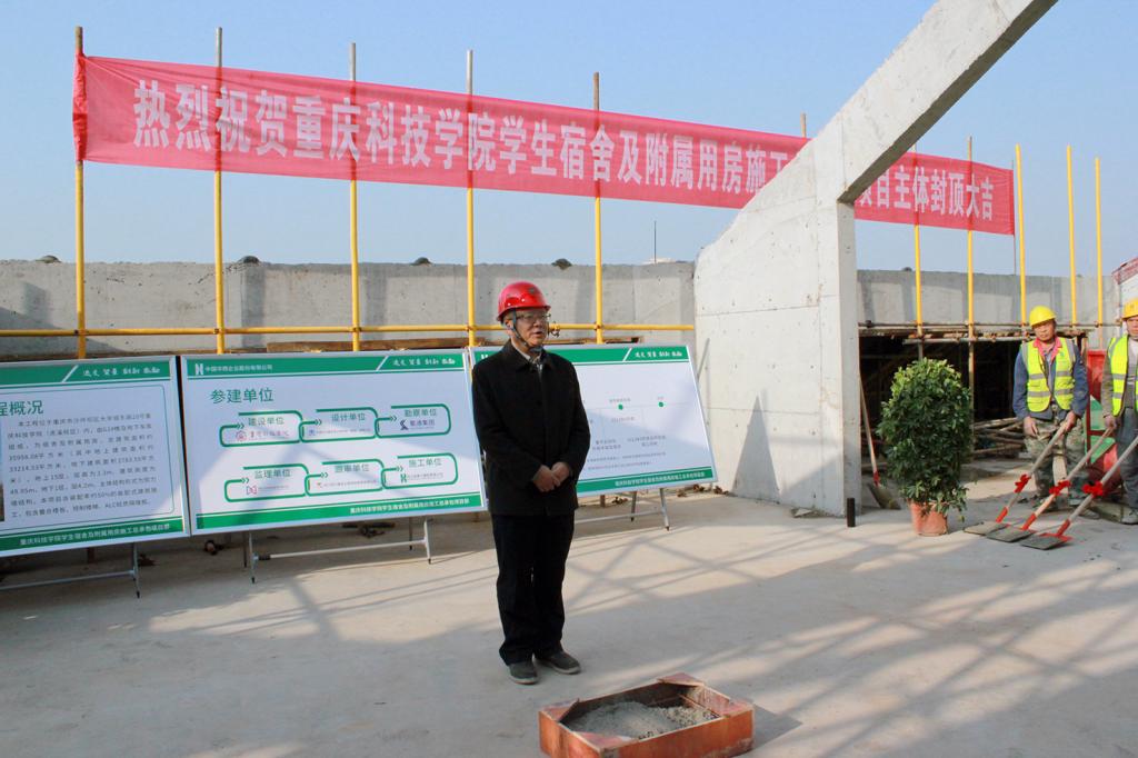 仪式上,尹华川、朱永利为学生宿舍及附属用房工程项目主体工程浇筑了最后一块混凝土。尹华川宣布学生宿舍及附属用房工程项目主体工程顺利封顶。