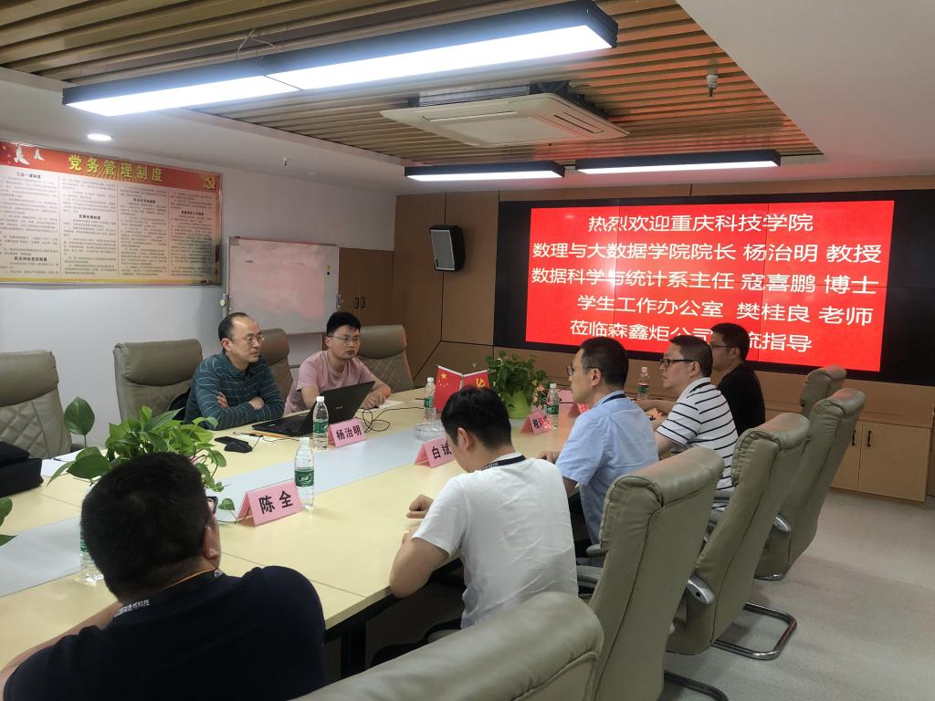 4月26日下午,数理与大数据学院院长杨治明一行走访重庆森鑫炬科技有限公司(以下简称“森鑫炬科技公司”),实地调研企业用人需求,洽谈拓展学生实习就业岗位资源、深化院企合作相关事宜。森鑫炬科技公司董事长白斌、技术经理陈全、财务经理税诗成、人事经理邹开波和商务经理张善良等参加。