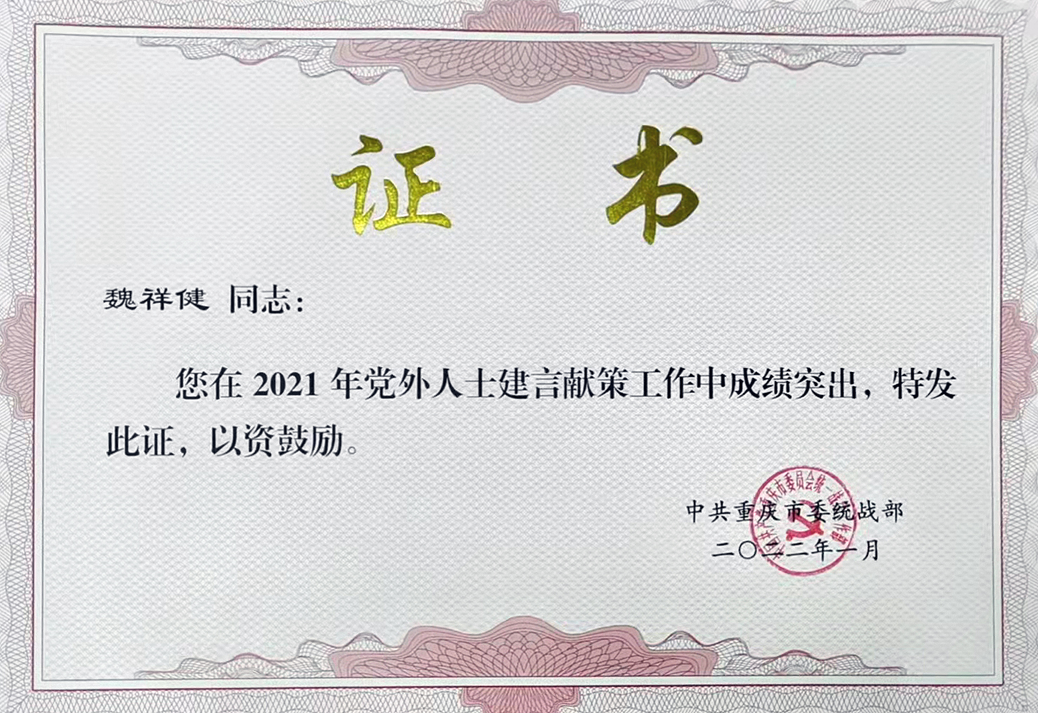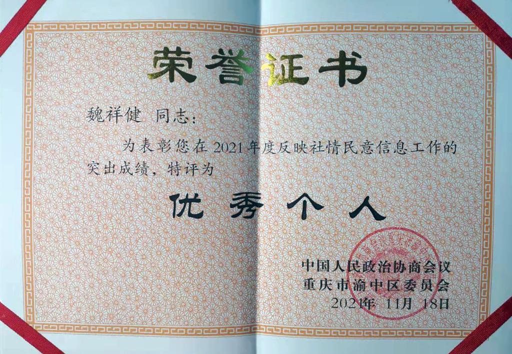 日前,米兰民革支部主委、工商管理学院教授魏祥健因参政议政成绩突出,分别受到市委统战部、渝中区政协表彰。