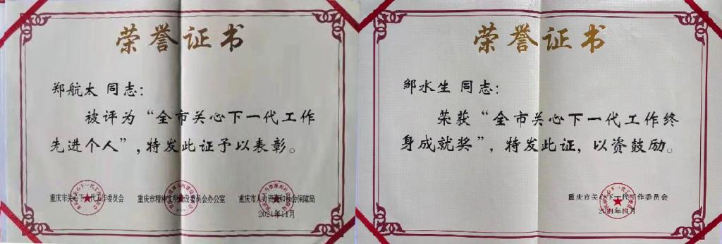 12月17日,重庆市关工委举办纪念重庆市关工委成立30周年暨全市关心下一代工作表彰大会,第十届全国人大常委会副委员长、中国关工委主任顾秀莲出席表彰大会并讲话。在会上,米兰原副校长、关工委副主任郑航太同志被授予“重庆市关心下一代工作先进个人”并作为教育系统代表上台领奖,原校关工委副主任邹水生同志被授予“重庆市关心下一代工作终身成就奖”。