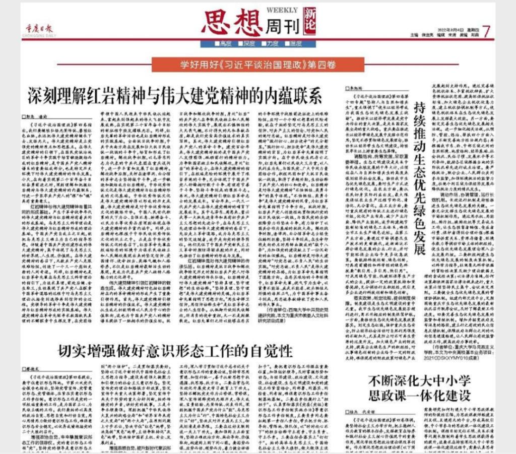 近日,《重庆日报》理论版发表校党委书记黎德龙署名文章《切实增强做好意识形态工作的自觉性》。