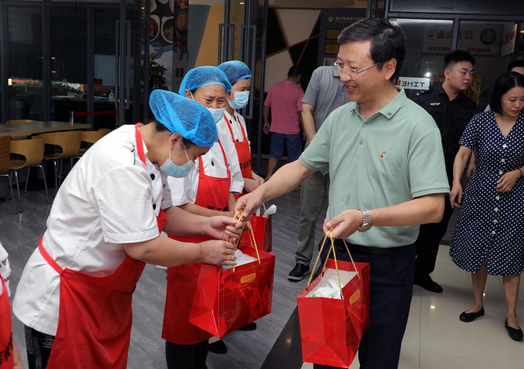 赵明阶一行先后来到和园5号公寓、容园食堂、研究生公寓和博文楼建设工地、学校南大门等场所与一线教职员工亲切交谈,详细询问工作情况。赵明阶代表学校对坚守一线的同志们致以亲切的问候,对他们在酷暑之中坚守工作岗位表示亲切的慰问和衷心的感谢,叮嘱大家要注意防暑降温,劳逸结合,合理安排工作休息时间,做好自身安全防护的同时严格落实各项疫情防控举措。