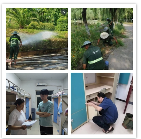物业服务,细致周密 物业服务组认真做好暑期校区房屋校舍、设施设备日常巡检,确保无安全隐患事故发生;精心组织安排暑期学生集中住宿及各类培训人员住宿工作,加强对留校人员用电、用水管理,为住户提供安全、卫生的住宿环境;加班加点完成学生公寓及教学楼设施设备的维修保养工作;强化公共区域卫生清扫工作,做到按时清洁,及时保洁;加强排污、排水泵的巡查工作,对天台、院坝地面进行冲洗,对地沟、水篦子进行清掏,做好暴雨防汛的准备工作;在做好日常清洁、花木养护工作的基础上,认真做好保苗抗旱工作;全力做好疫情防控后勤保障工作,对全校教学和办公区域进行预防性消杀,保障健康管理区的日常运行服务。