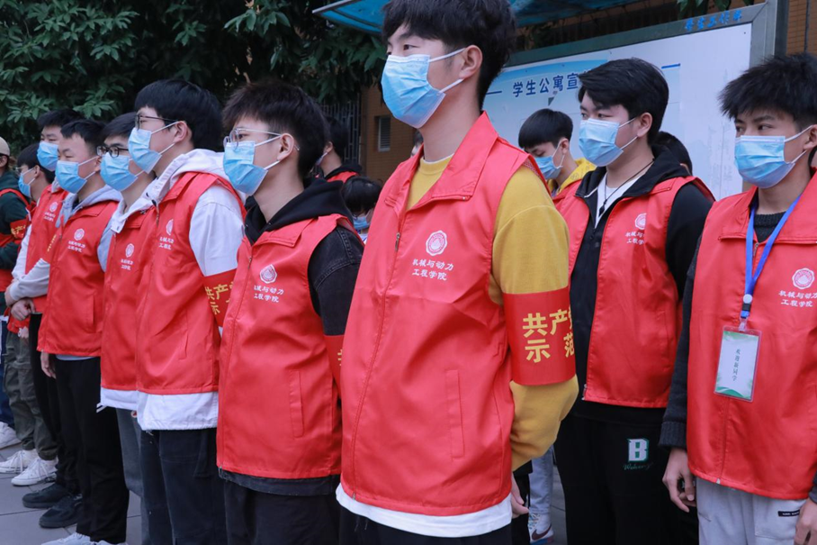 党旗的光照亮我们的未来。“我是党员,我先上。”机设智造学生党支部陈钟游主动请战。在学校疫情防控最关键、最紧要时期,机械与动力工程学院的党员们积极响应学校“切实筑牢守好校园疫情防控安全屏障,共同打好打赢疫情歼灭战”的号召,自发组成“党员志愿服务小分队”,主动投身学校疫情防控志愿服务中,用青春和热血守护校园安全稳定。党员同志不畏艰险冲锋“疫”线、用意志铸成疫情防控的铜墙铁壁,为打赢疫情防控阻击战奉献自己的力量。