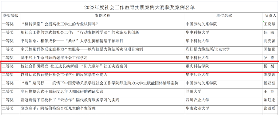 近日,由中国社会工作教育协会华南片区和北京师范大学社会发展与公共政策学院联合举办的2022年度社会工作教育实践案例大赛公布评审结果,米兰法政与经贸学院杨梨老师团队(团队成员:梁俊花、徐迎春、程鹏立)荣获二等奖。