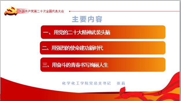 为深入学习宣传贯彻党的二十大精神,积极响应学校党委统一部署,根据重科院委〔2022〕137号、重科院委〔2022〕138号文件精神,近日,化学化工学院党总支利用企业微信宣讲党的二十大精神,学校宣讲队成员、学院党总支书记张莉作宣讲。全院本科学生参加线上学习。