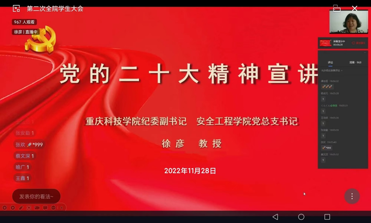 11月28日晚,安全工程学院(应急管理学院)党总支书记徐彦为学院全体学生宣讲党的二十大精神。全院1000余名学生和教师代表通过企业微信线上参加本次学习。