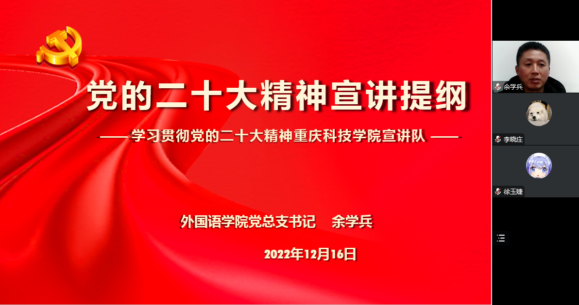 12月16日,外国语学院举行学习贯彻党的二十大精神线上宣讲会,学院党总支书记余学兵作理论宣讲,带领2019级、2020级本科生及辅导员共同深入宣传学习党的二十大精神,引导师生统一思想凝聚力量,进一步聚焦聚力党的二十大确定的各项任务。