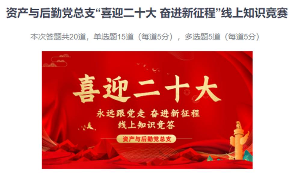 为深入学习宣传贯彻党的二十大精神,切实把全体党员的思想统一到党的二十大精神上来,把力量凝聚到党的二十大确定的各项任务上来,资产与后勤党总支于近期举办了学习贯彻党的二十大精神线上知识竞赛活动。