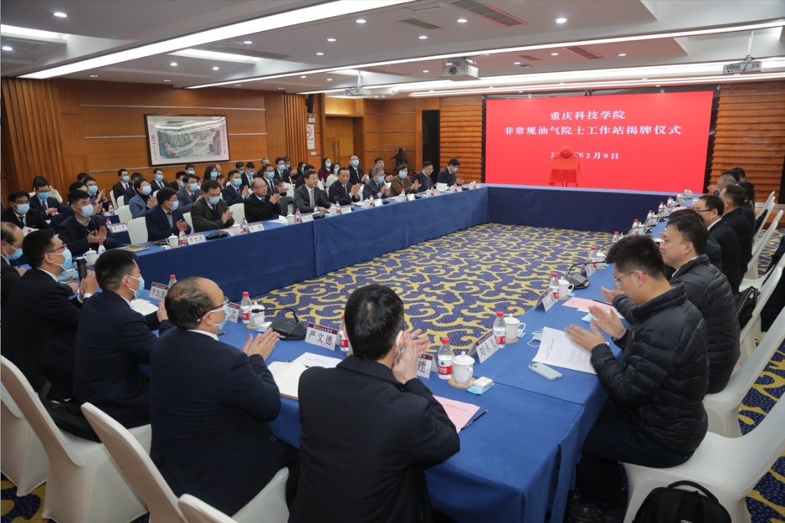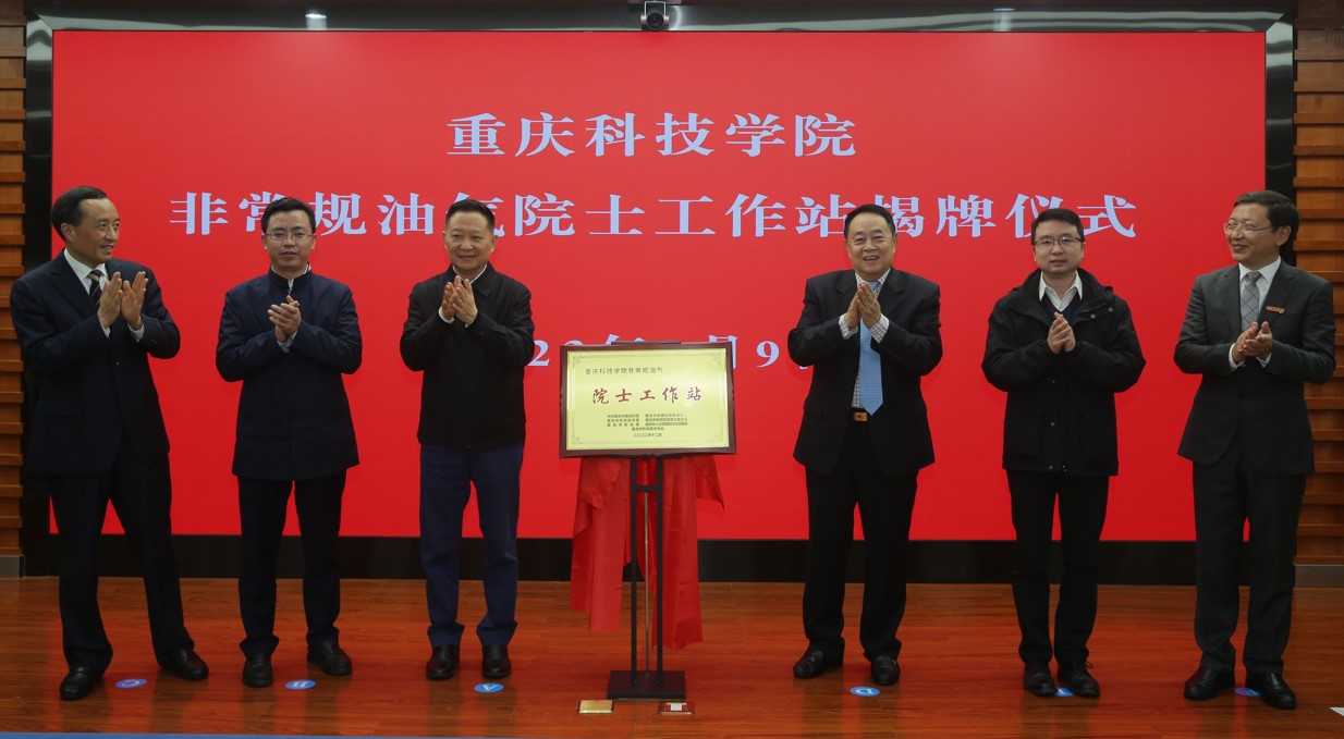 张丹宣读《关于同意建立重庆科技学院非常规油气院士工作站的批复》。颜朝华与周守为院士共同为重庆科技学院非常规油气院士工作站揭牌。