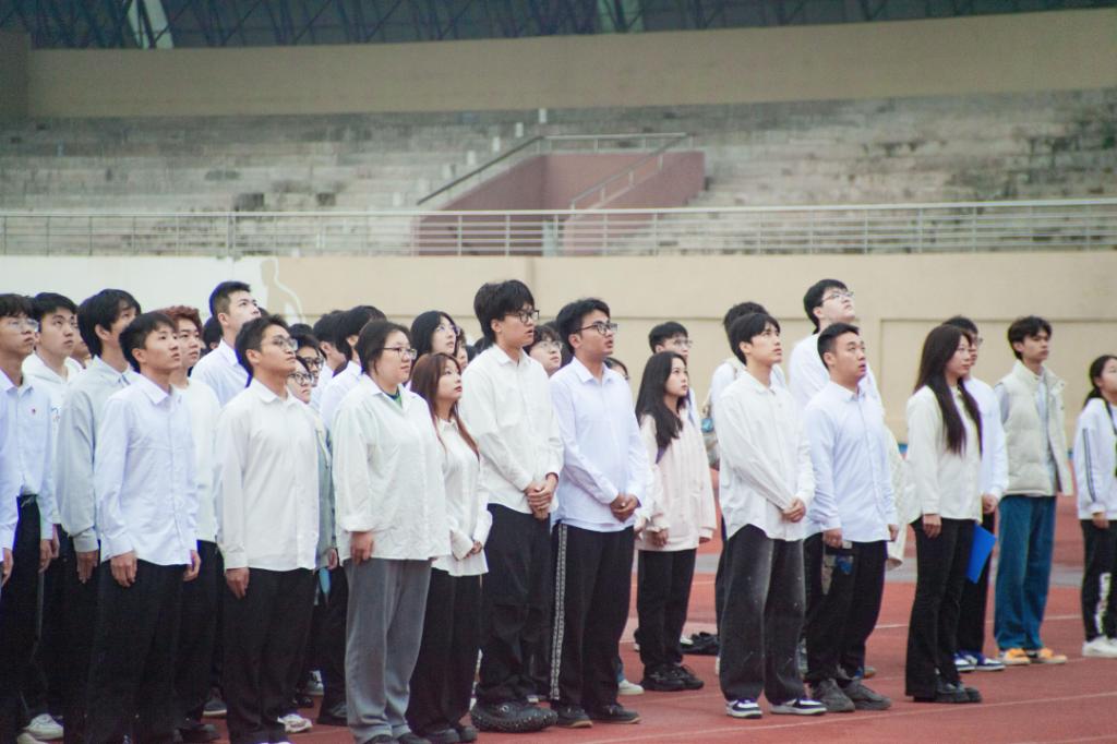 为热烈庆祝中华人民共和国成立75周年,倡导广大青年树立“知廉、敬廉、践廉”的良好风尚,10月8日,学校在立德体育场举行“青春路·廉同行”升国旗仪式。校团委、校学生会、研究生会、校青年志愿者协会、学生媒体中心、学生社团管理部、大学生艺术团全体学生骨干共计1000余人参加。此次升旗仪式由校学生会主席袁正兴主持。