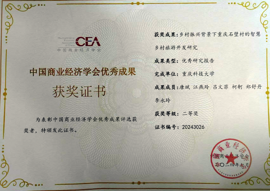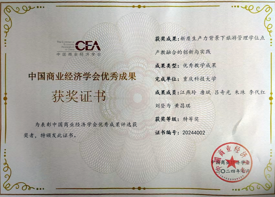 近日,中国商业经济学会主办的第三届新商科教学与学术年会上揭晓了第三届优秀成果奖的评选结果。米兰江燕玲教授的教学成果“新质生产力背景下旅游管理学位点产教融合的创新与实践”荣获优秀教学成果类特等奖,唐斌副教授的研究报告“乡村振兴背景下重庆石壁村的智慧乡村旅游开发研究”荣获优秀研究报告类二等奖。本次评选共有全国400余所高校的1000余项成果参与。
