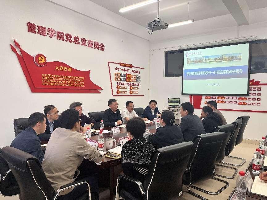 10月11日上午,校长赵明阶、党委副书记谭勇深入管理学院调研指导工作。党政办公室、教务处、研究生院、科技处等部门负责人陪同调研。管理学院全体班子成员、三级机构负责人、科级干部、教授博士代表等参加了调研座谈会,座谈会由管理学院党总支书记李旭东主持。