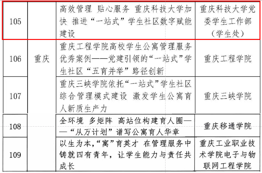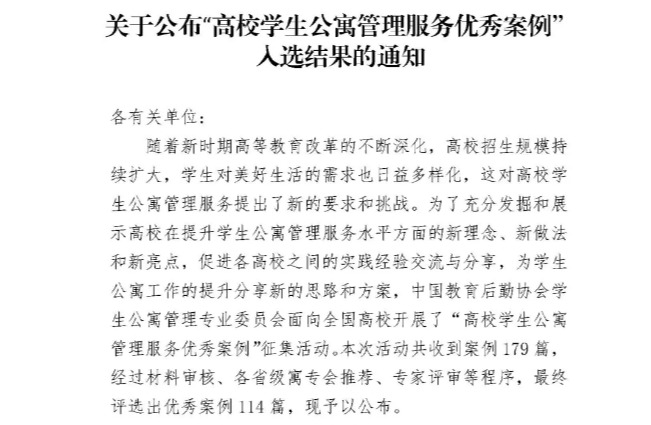 近日,中国教育后勤协会学生公寓管理专业委员会面向全国高校开展了“高校学生公寓管理服务优秀案例”征集活动。经过材料审核、各省级寓专会推荐、专家评审等程序,全国最终评选出优秀案例114篇,米兰作为重庆市五个高校案例之一成功入选。