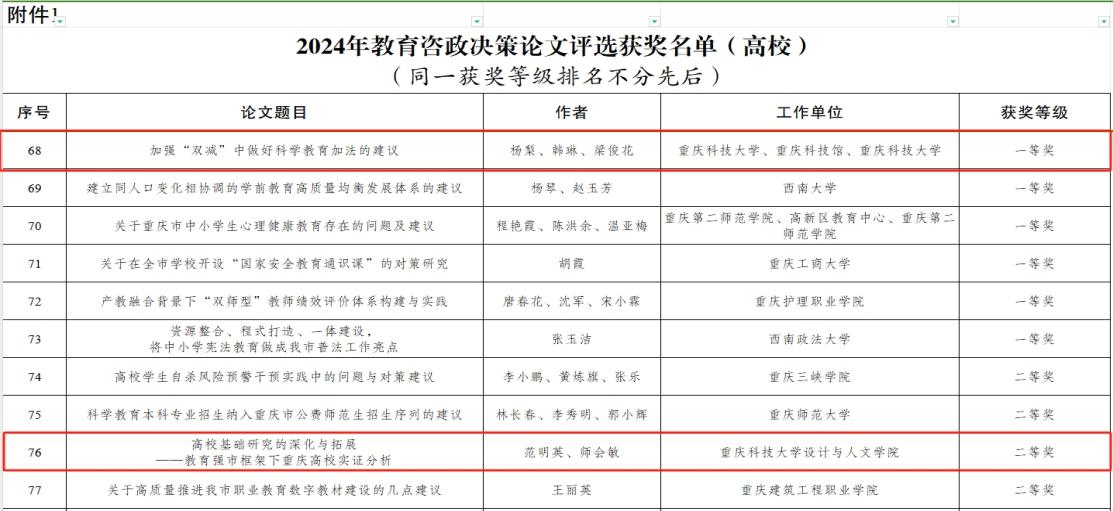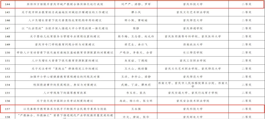 据了解,本次评选活动由重庆市教育委员会组织,旨在通过征集教育咨政决策论文,推动教育改革发展,解决人民群众关心的教育问题,并为教育强市建设提供智力支持。学校历来高度重视教育咨政决策,近年来组织全校教职员工围绕教育高质量发展的机制和体制障碍提出一系列具有参考价值的建议,连续多年在该评选活动中取得优异成绩。接下来,学校将继续鼓励广大师生围绕成渝地区双城经济圈建设等重大课题进行深入研究,助力教育强市建设,为现代化新重庆建设提供智力支持。