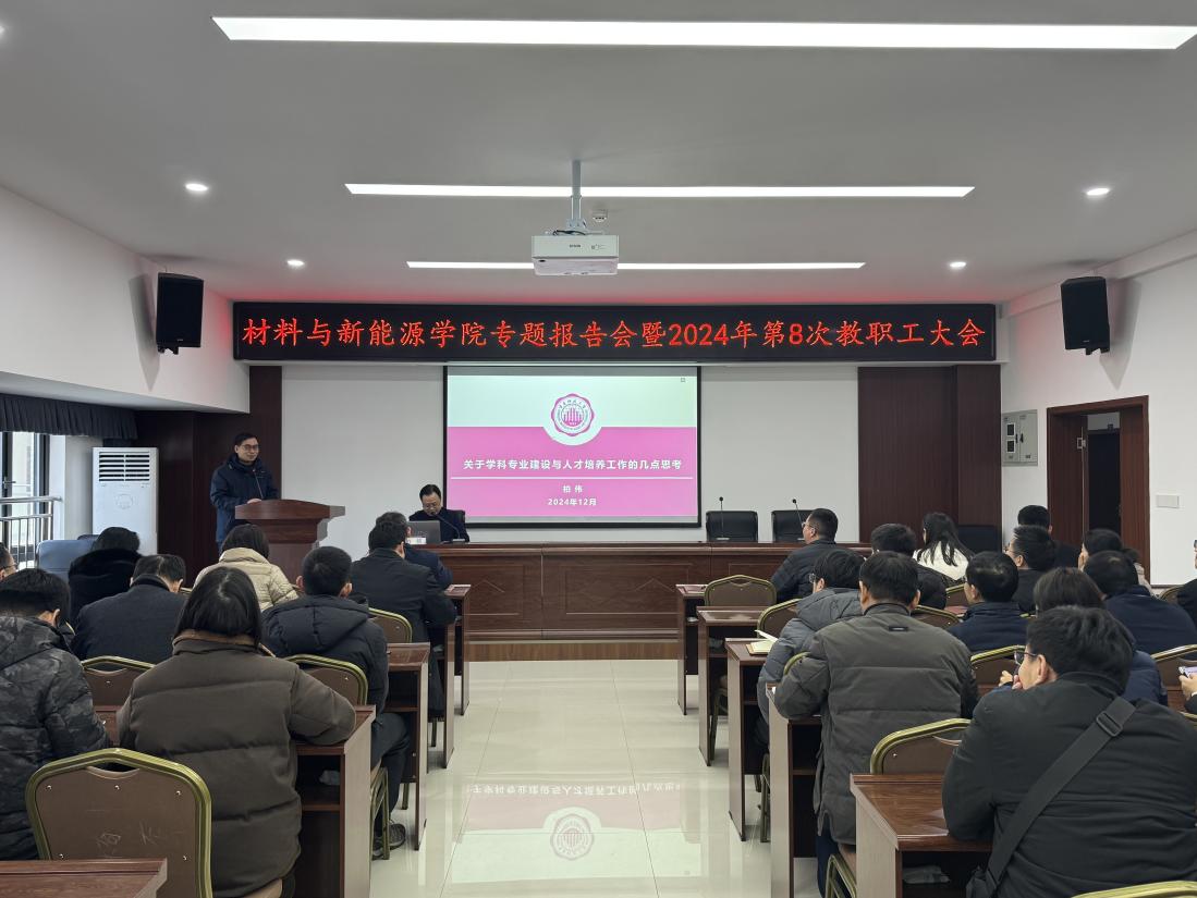 12月31日下午,材料与新能源学院在知行楼M508会议室召开专题报告会暨2024年第8次教职工大会。学校党委常委、副校长柏伟作题为“关于学科专业建设与人才培养工作的几点思考”的专题报告。材料与新能源学院全体教职工参加会议,院长韩涛主持会议。