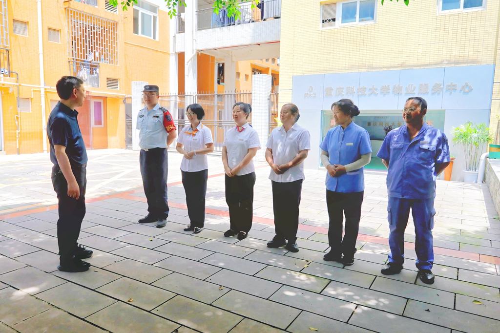 赵明阶来到物业服务中心,看望慰问了留校值守的后勤工作人员,并面对面交流,详细了解假期后勤服务及应急值守情况,对全体值守人员“舍小家、顾大家”的奉献精神给予高度肯定,并代表学校送上节日的美好祝福。
