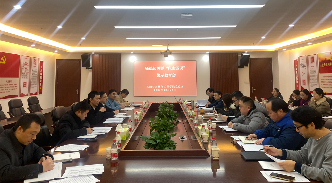 为进一步加强师德师风建设,营造良好育人氛围,12月28日,石油与天然气工程学院在笃行楼K434会议室召开了师德师风暨“以案四说”警示教育会。学院班子成员、组织员、党总支委员、科级干部、系(所)中心主任、全体党支部书记参加,会议由党总支书记谢家建主持。