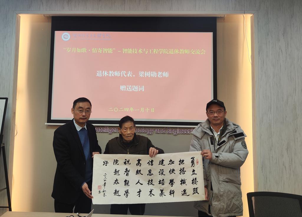 退休教师代表梁树勋赠送题词寄语智能技术与工程学院培养信息技术人才高质量发展,参会老师围绕“重科精神传颂四方”“智能学院专业学科发展”“优化校友工作机制”等问题展开交流讨论。退休老师们一致表示,将继续关注学校和学院变化和发展,关心学院校友工作,继续发挥余热,为传播重科文化贡献智慧和力量。会后,智能技术与工程学院退休教师参观了校园。