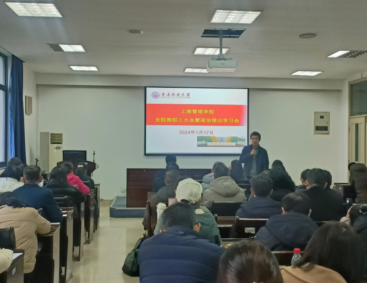 1月17日,工商管理学院在博学楼F312会议室召开教职工大会暨政治理论学习会。会议由党总支书记李旭东主持,全院教职工参加了会议。