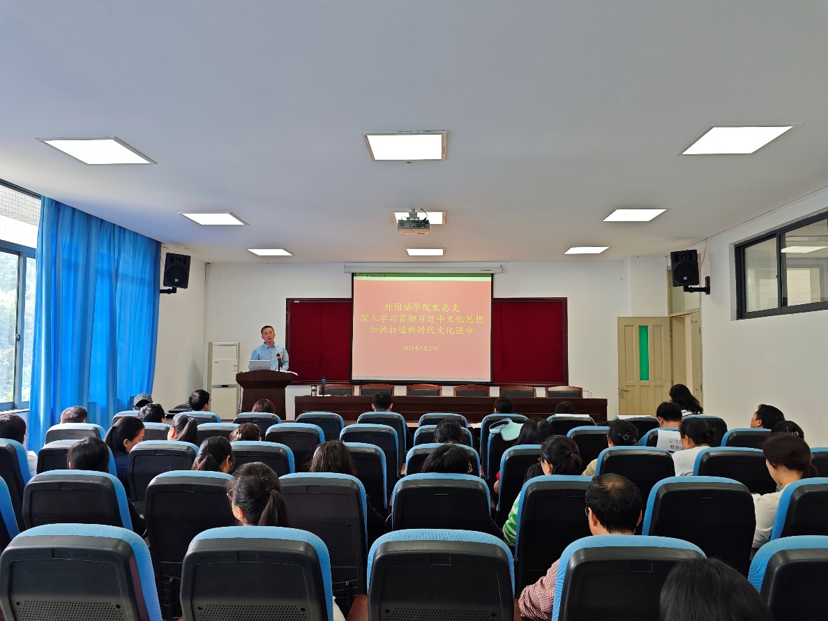 2024年4月3日下午,外国语学院党总支在厚德楼H214会议室,开展“深入学习贯彻习近平文化思想,加快打造新时代文化强市”宣讲,外国语学院全体教职工参加学习,党总支书记余学兵宣讲。