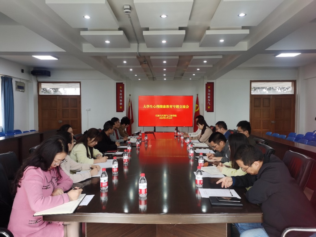 为进一步提升学院心理健康教育服务水平,全面提高大学生心理健康教育质量,4月12日上午,石油与天然气工程学院在和园二号F0003会议室召开学生心理健康教育专题交流会。学生处心理健康教育与咨询中心主任向守俊、石油与天然气工程学院全体专兼职辅导员及研究生导师代表参加了分享交流。