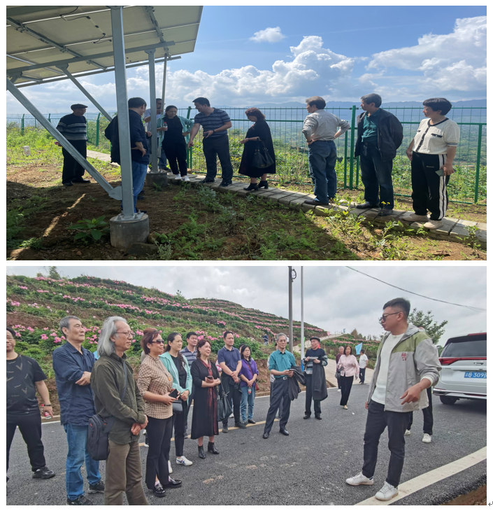 在田勤思、周博、许文林三位驻村第一书记陪同下,离退休民主党派代表先后调研了徐白村芍药鲜切花采摘园和太安村花椒种植基地、“农光互补”光伏发电项目。