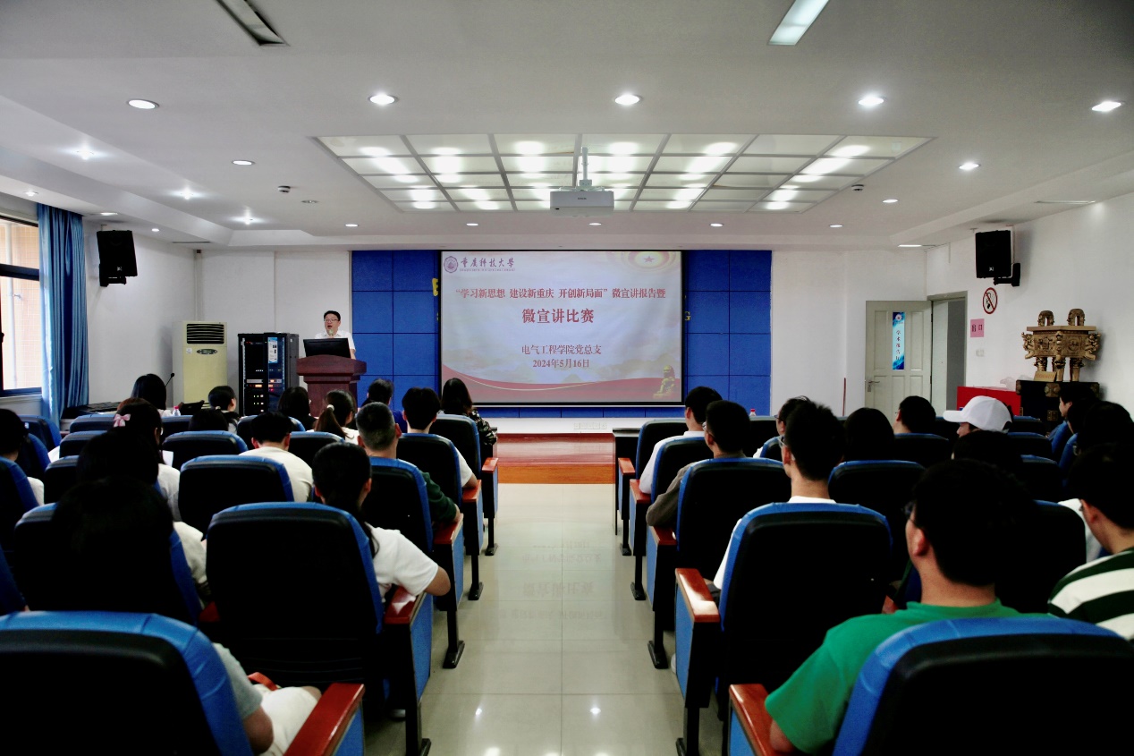 为深入学习宣传贯彻习近平新时代中国特色社会主义思想和党的二十大精神,5月16日,电气工程学院党总支举办了“学习新思想 建设新重庆 开创新局面”理论微宣讲报告暨微宣讲比赛。党委宣传部刘俞余老师、学院党总支委员和组织员担任此次微宣讲活动评委。全院师生党员共100余人参会。比赛由学院党总支副书记余波主持。