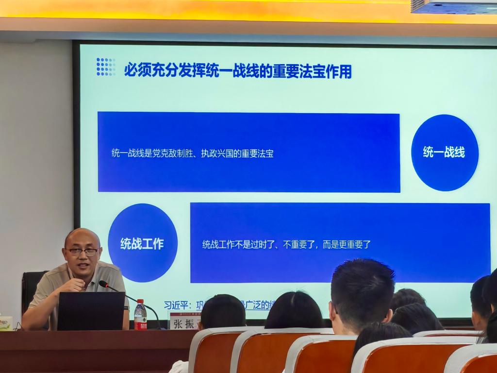张振飞结合百年党史,系统梳理了中国共产党统一战线的形成和发展史,总结了统一战线工作的历史性成就,对习近平总书记关于做好新时代党的统一战线工作的重要思想进行了深刻解读,结合学校实际就贯彻学习要求进行了全面阐释,对新时代青年在做好统战工作中的责任与担当提出了期望。讲座内容丰富、内涵深刻,让学生学有所思、思有所悟、悟有所为,进一步坚定了当代青年学生的政治信仰,增强了青年学生的统战意识。