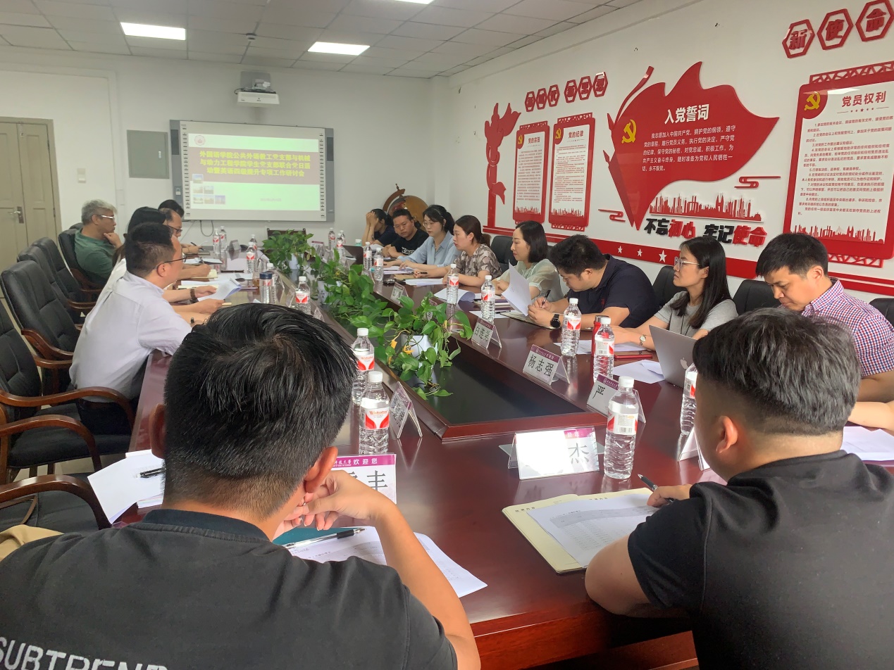 6月19日上午,外国语学院公共外语教工党支部与机械与动力工程学院学生党支部在机械与动力工程学院砺志楼L303联合开展党日活动暨英语提升专项工作研讨会。学校学风督导组,外国语学院和机械与动力工程学院党政班子、教师党员代表和辅导员合计20余人出席本次会议,会议由机械与动力工程学院党总支书记邹莉主持。