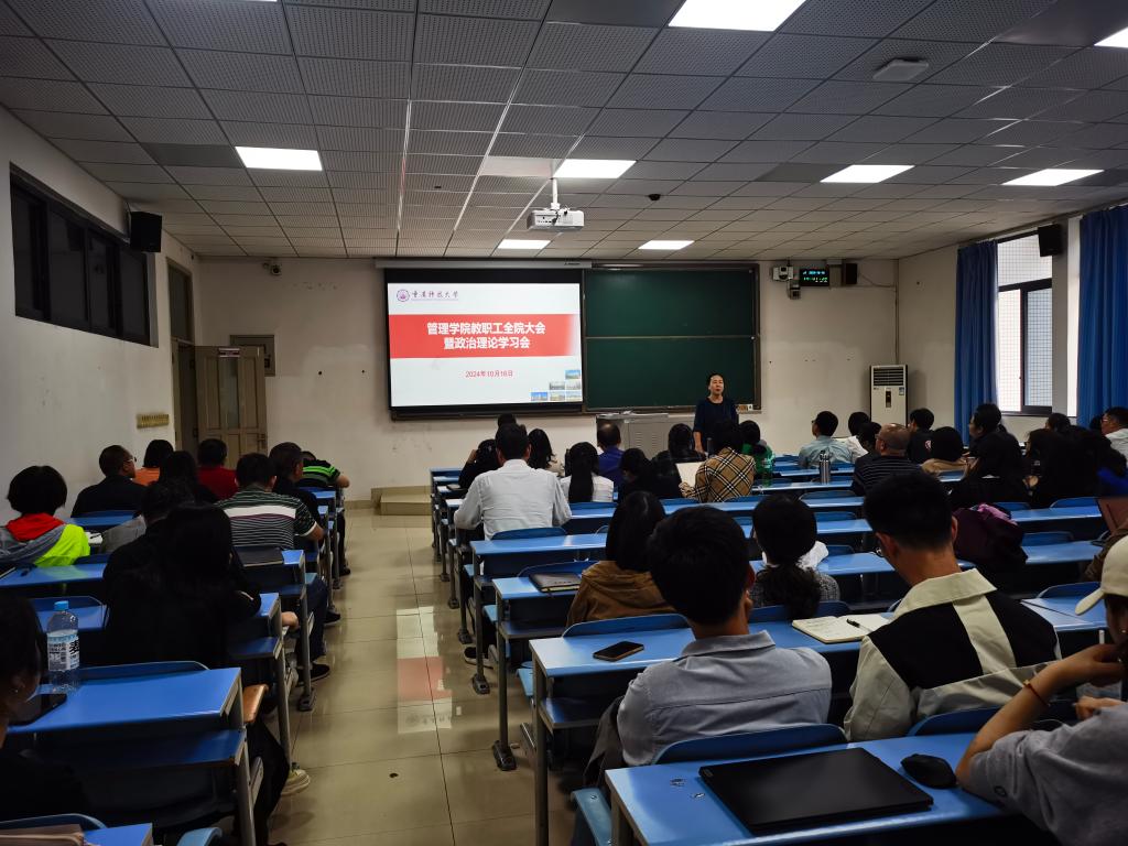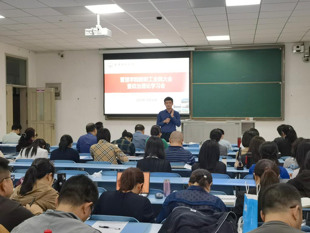10月16日下午,管理学院在博学楼E313召开教职工全院大会暨政治理论学习会。会议由学院党总支书记李旭东主持。
