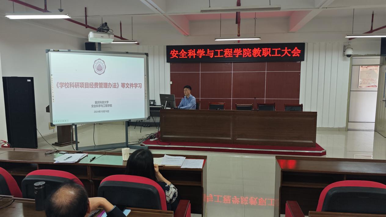 为进一步落实学校全面从严治党专题会议精神,抓好学习促提升,聚焦案例促整改,10月16日下午,安全科学与工程学院在笃行楼K322会议室召开了学院召开科研项目经费管理培训暨警示教育大会,全体教职工参加了会议,会议由学院党总支书记王艳主持。