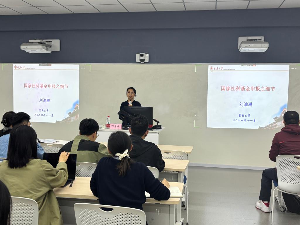 为深化落实“有组织的科研”,提升国家社科基金申报质量,管理学院于11月6日举办国家社科基金申报交流会。国家高层次人才特殊支持计划领军人才、重庆大学公共管理学院刘渝琳教授应邀在教学主楼B317多功能室作国家社科基金申报专题报告。会议由管理学院院长江燕玲主持,管理学院师生100余人通过线上、线下方式共同参会交流。