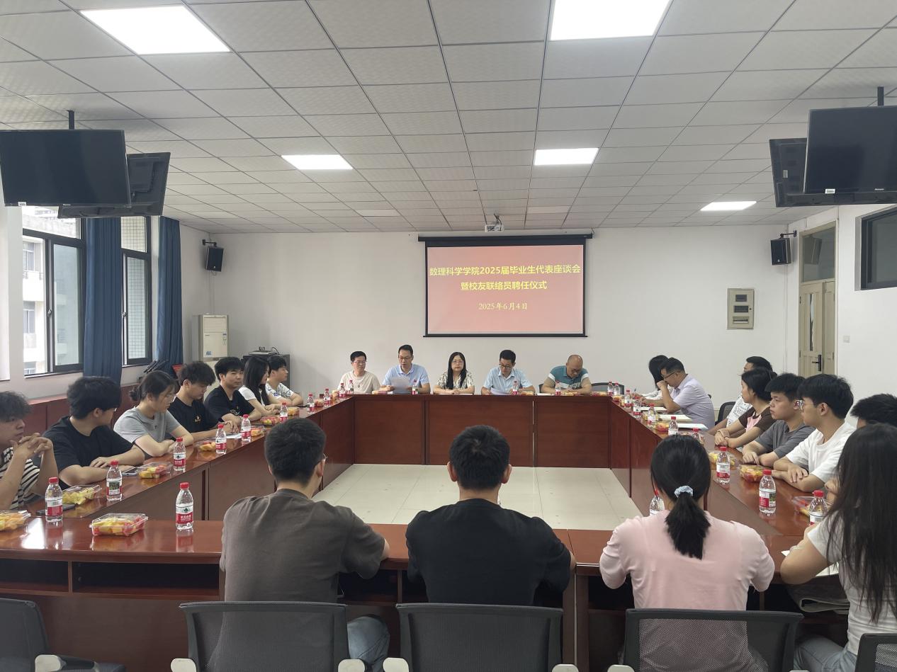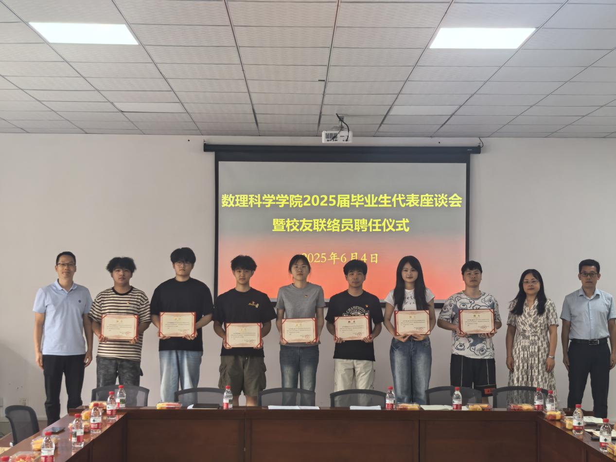 为倾听毕业生心声,了解毕业生对学院发展的意见和建议,进一步做好校友工作,6月4日上午,数理科学学院在厚德楼G408会议室举行2025届毕业生代表座谈会暨校友联络员聘任仪式。学院班子成员、专业负责人、科级干部、毕业班辅导员、毕业生代表和受聘联络员参加了会议。