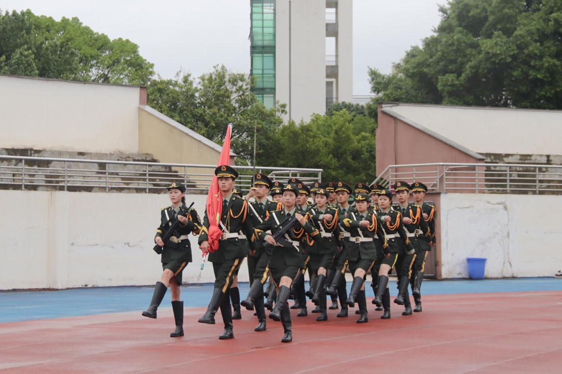 清晨,朝阳初升,国旗护卫队迈着整齐划一、气势昂扬的步伐护送国旗走向升旗台。伴随着雄壮的国歌声,鲜艳的五星红旗冉冉升起,全体师生怀着崇敬的心情行注目礼,齐唱国歌。