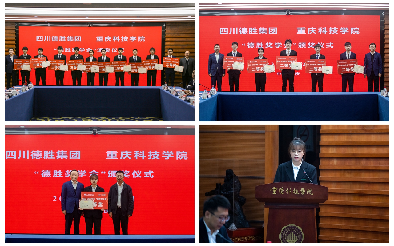 颁奖仪式上,与会领导为获奖学生颁发了获奖证书与奖牌。德胜钒钛副总经理、重庆科技学院校友会四川德胜分会会长麦吉昌寄语获奖学生。获奖学生代表进行了表态发言。