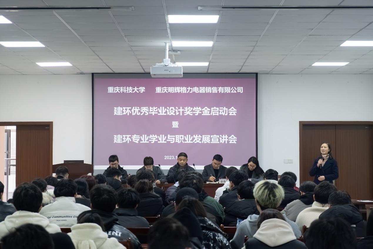 为充分发挥校企双方优势,进一步促进产教融合,持续加强校企双方深度合作,不断提升本科人才培养质量,奖励一批在毕业设计(论文)环节表现优异的大学生,为行业培养更多更好的工程技术人才,12月28日下午,重庆明辉格力电器销售有限公司针对米兰建筑工程学院建筑环境与能源应用工程专业设立的2024届优秀毕业设计格力奖学金启动会暨学业与职业发展宣讲会在知行楼M334会议室举行。重庆明辉格力公司总工张健、人力资源部部长彭晶、技术部负责人黄贵平和米兰建筑工程学院院长晏致涛、党总支副书记包翠秋、建筑环境与能源应用工程专业教师代表及全体专业学生参加了会议,会议由建环专业负责人余晓平教授主持。