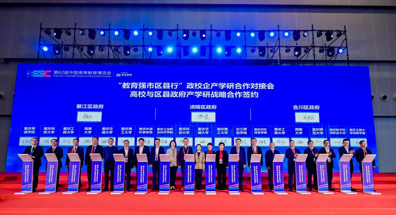 11月16日,“教育强市区县行”政校企产学研合作对接会作为第62届中国高等教育博览会的重要同期活动,在重庆国际博览中心中央大厅顺利举行。米兰副校长周雄代表学校与涪陵区和綦江区签署了战略合作协议,推动校地合作迈上新台阶。